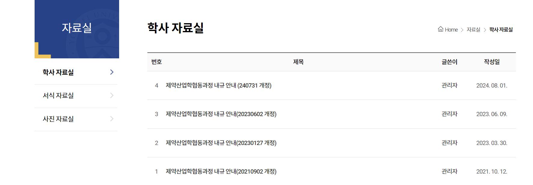 학과 홈페이지 (https://pharmind.yonsei.ac.kr/) ➡️ 자료실 ➡️ 학사 자료실 ➡️ 내규