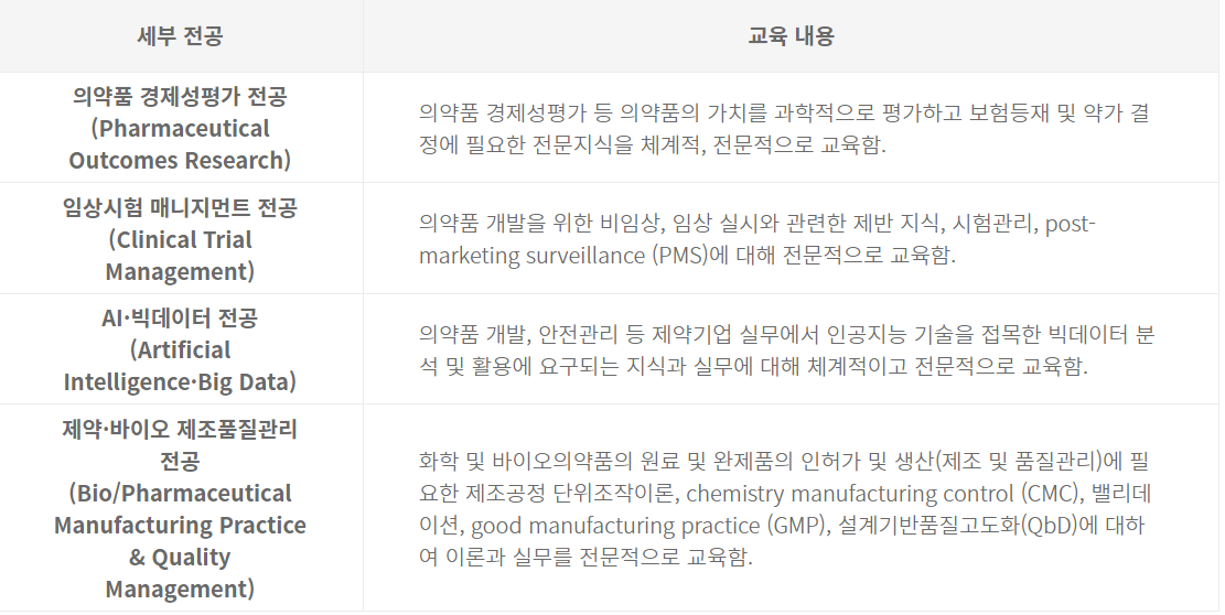 제약산업현장실습 1,2(각 3) 약사관계 법규 및 인허가제도(3) 의약품정책론(3) 약리학특론 1,2(각 3) 기초약물치료학(3) 의약품 글로벌 마케팅론(3) Pharma Marketing의 이해와 실전(3) 제약산업과 관련된 타 대학원 과목(3): 대학원 약학과, 제약의료규제과학과, 바이오융합대학원(K-NIBRT) 과목 |