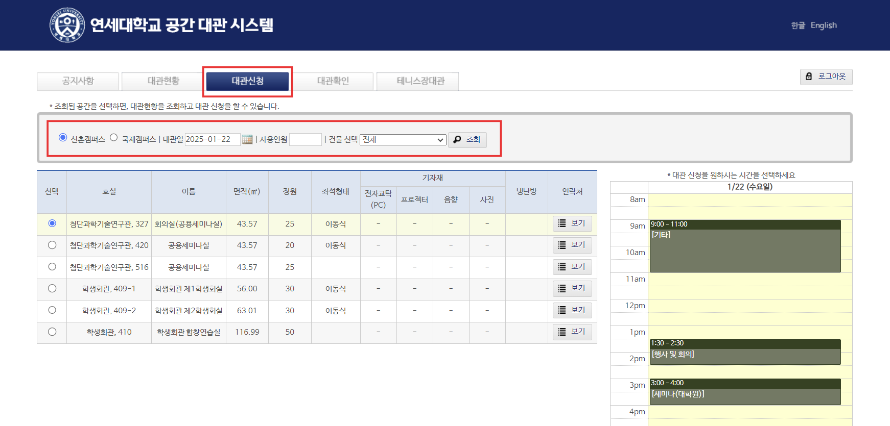 - 대관 신청 (캠퍼스/건물/시간 선택 후 신청)