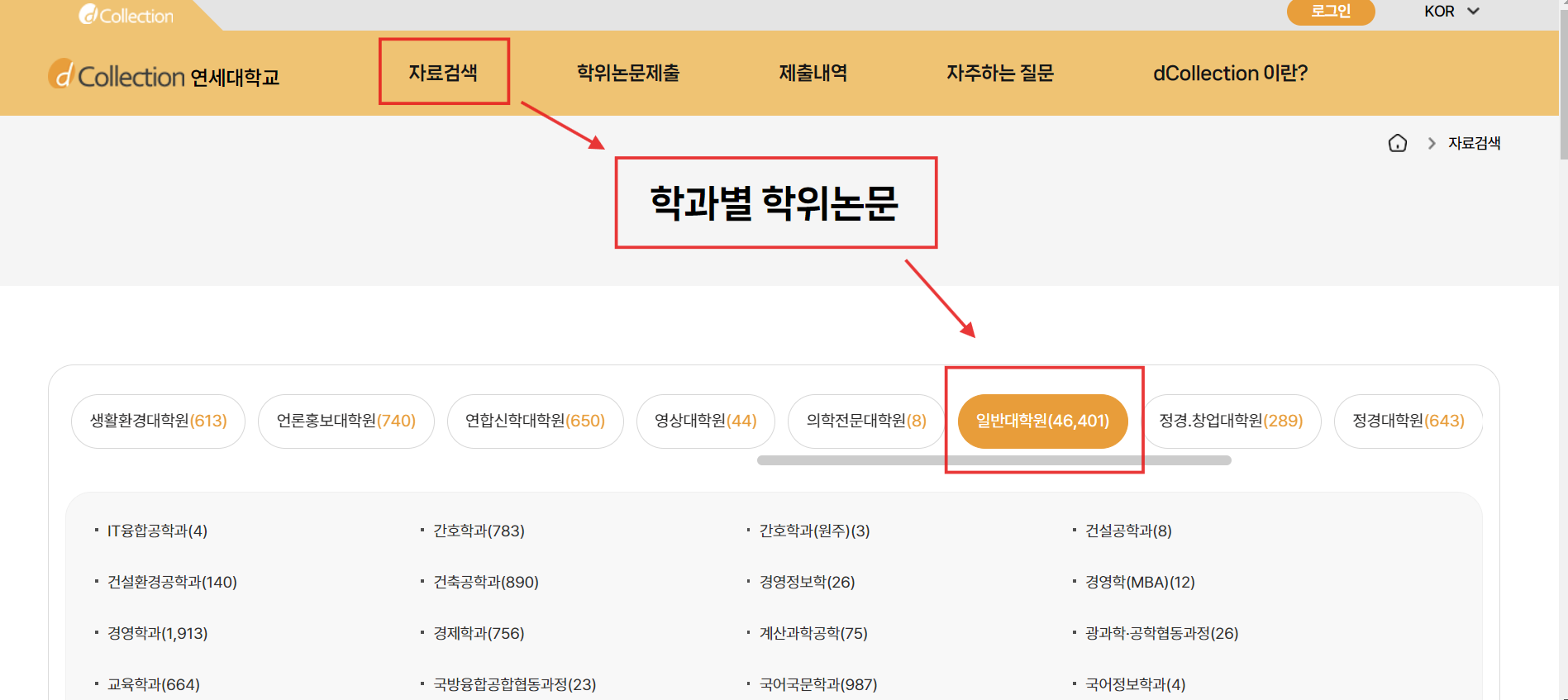 1. Collection → 연세 디지털 컬렉션 → 연세대 학위논문 클릭