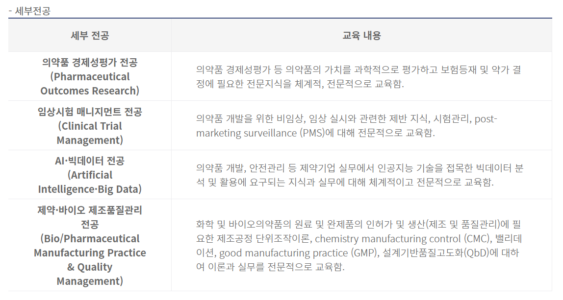 아래 사진은 연세대학교 제약산업학협동과정 세부전공 안내 표인데요~